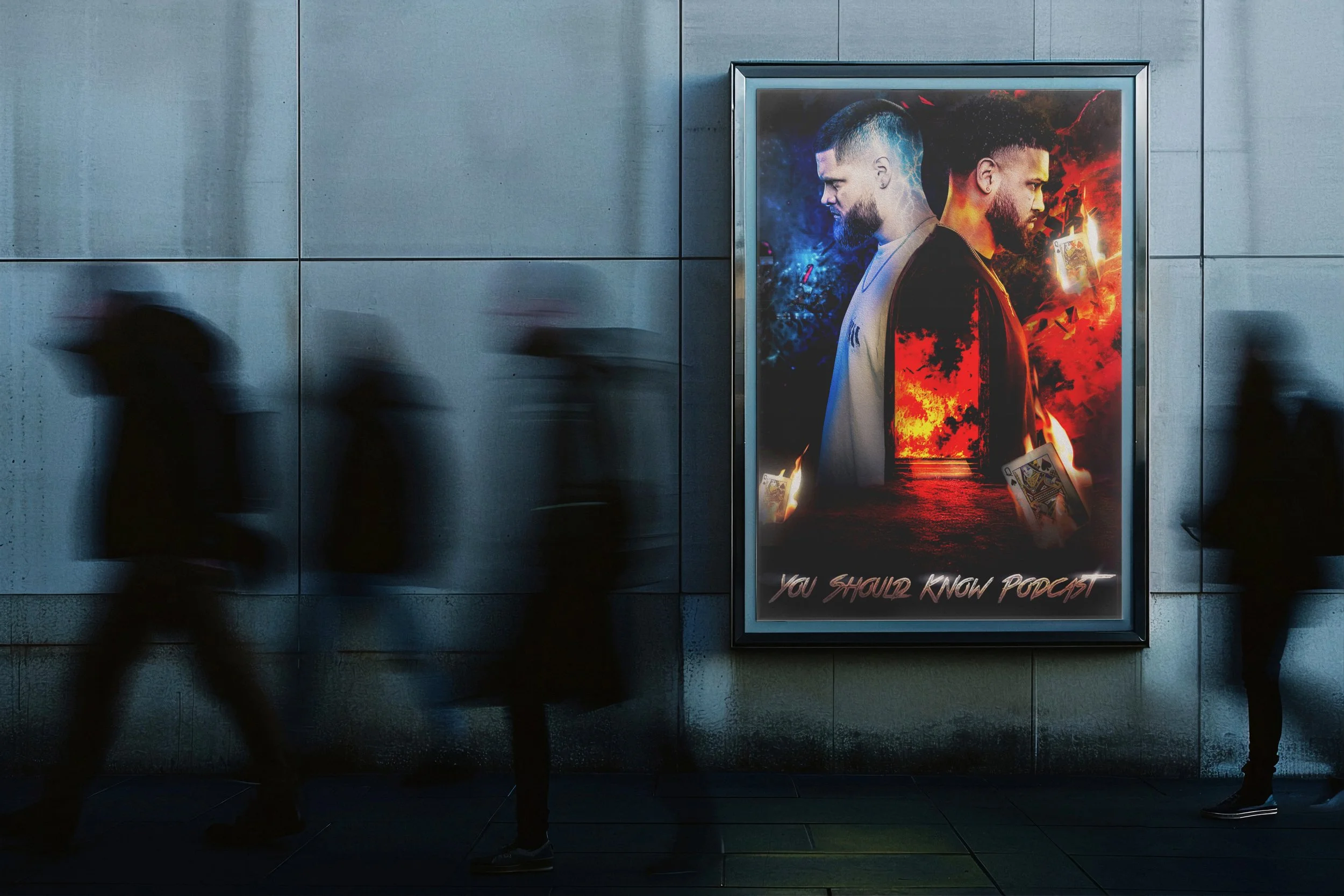 Designed a bold, dynamic poster capturing the energy of the podcast. Split composition, vibrant colors, and playful elements like fire, lightning, and playing cards highlight the hosts’ personalities and make the design visually striking.